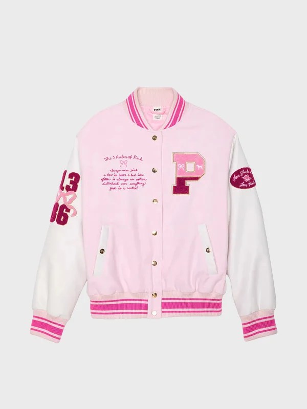 Thoughtful detailing elevates the design, from clean stitching to subtle branding elements that reflect the brand’s romantic identity. Functional side pockets add everyday convenience without disrupting the sleek finish. As a standout pink varsity jacket, it pairs effortlessly with denim skirts, high-waisted jeans, or layered over dresses for that contrast-core aesthetic.